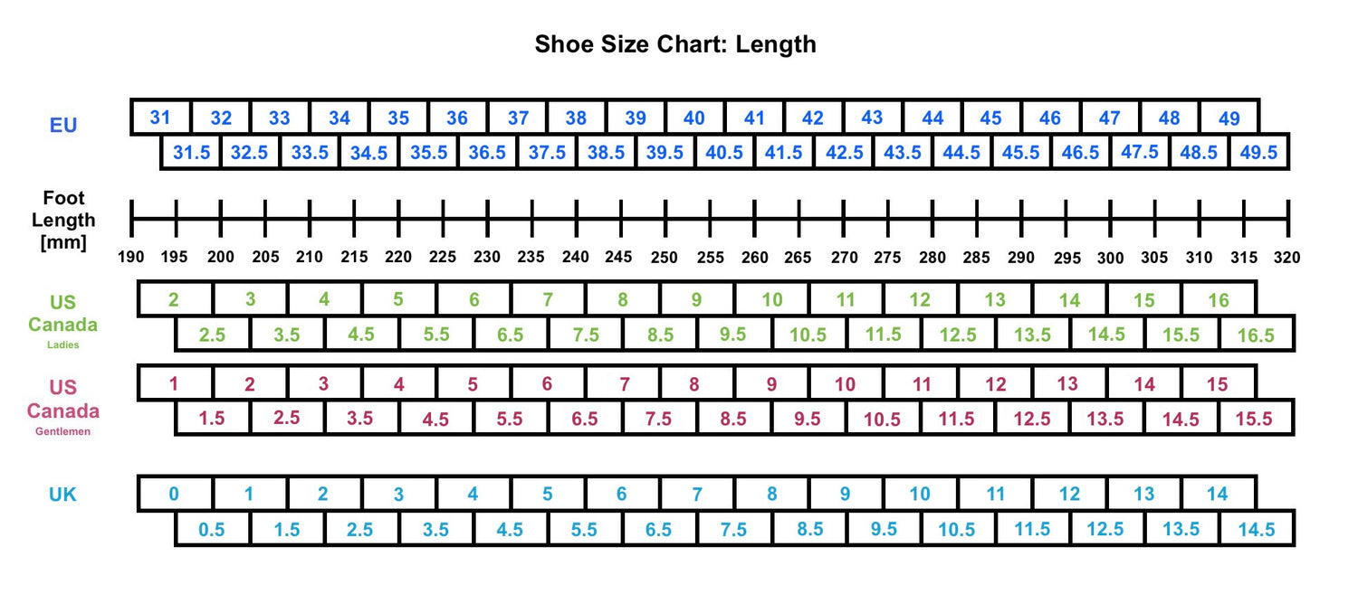 Find the foot length you measured in millimetres in the Shoe Size Chart: Length below. Follow a line up to determine your best EU size or down for Canada/US and UK sizes.