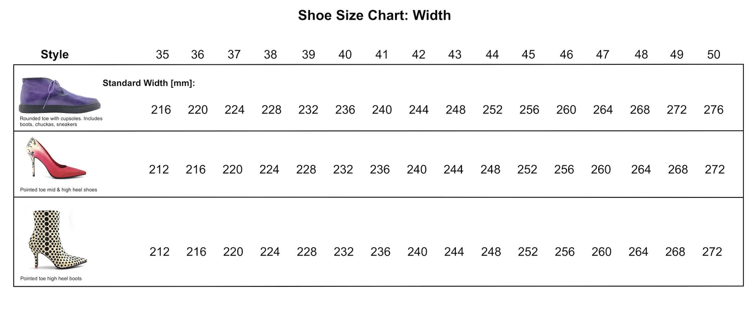 For example, if your foot length measures 260mm, size 41 EU or 9.5/10 US Ladies(8.5/9 Gentlemen) and 7.5/8 UK will most likely fit best for rounded toe and flat-4cm heeled footwear. You may need to go up a half or full size for tapered/pointed toe footwear styles. Alternatively, a wider size may be better in this case.