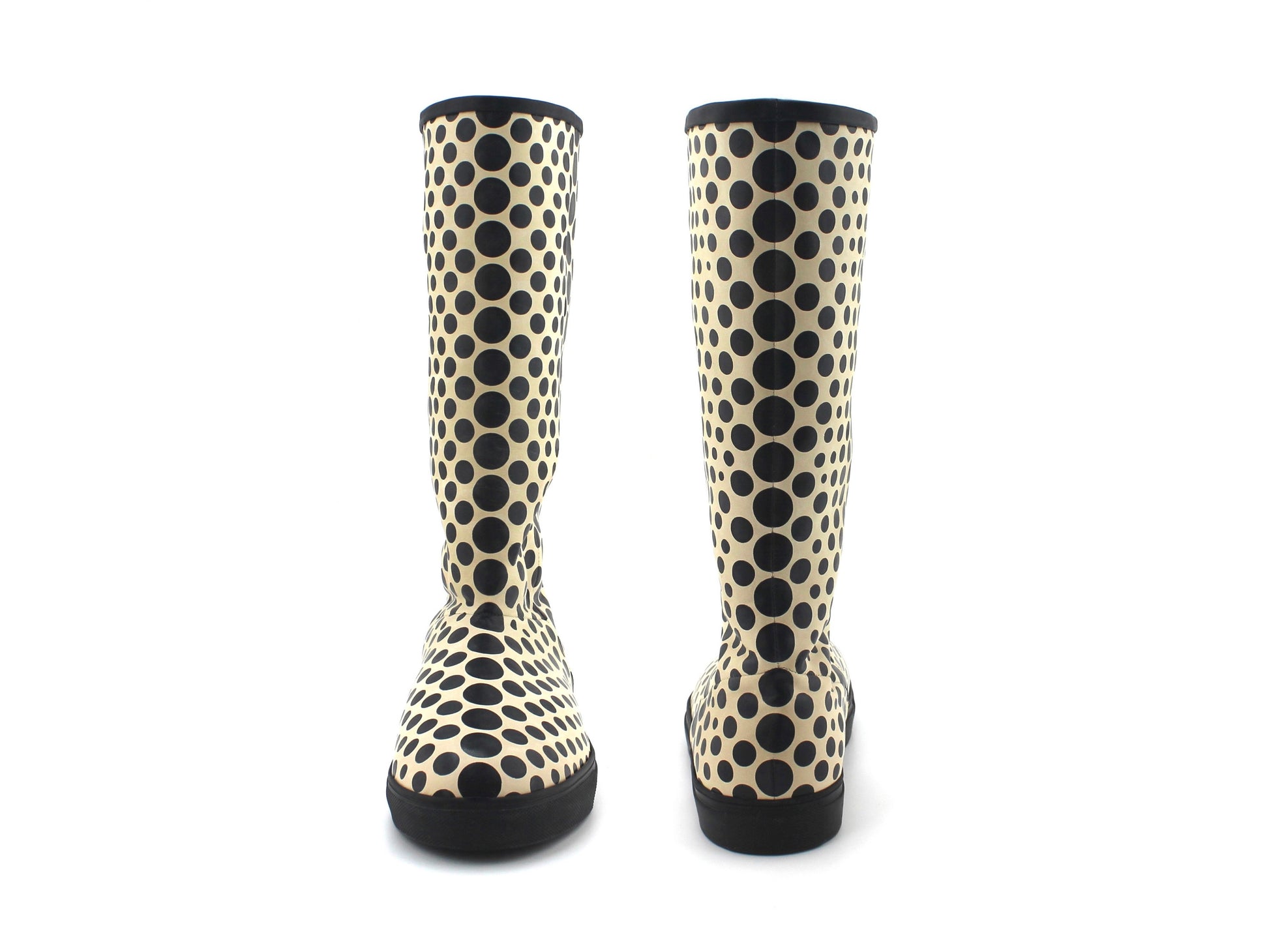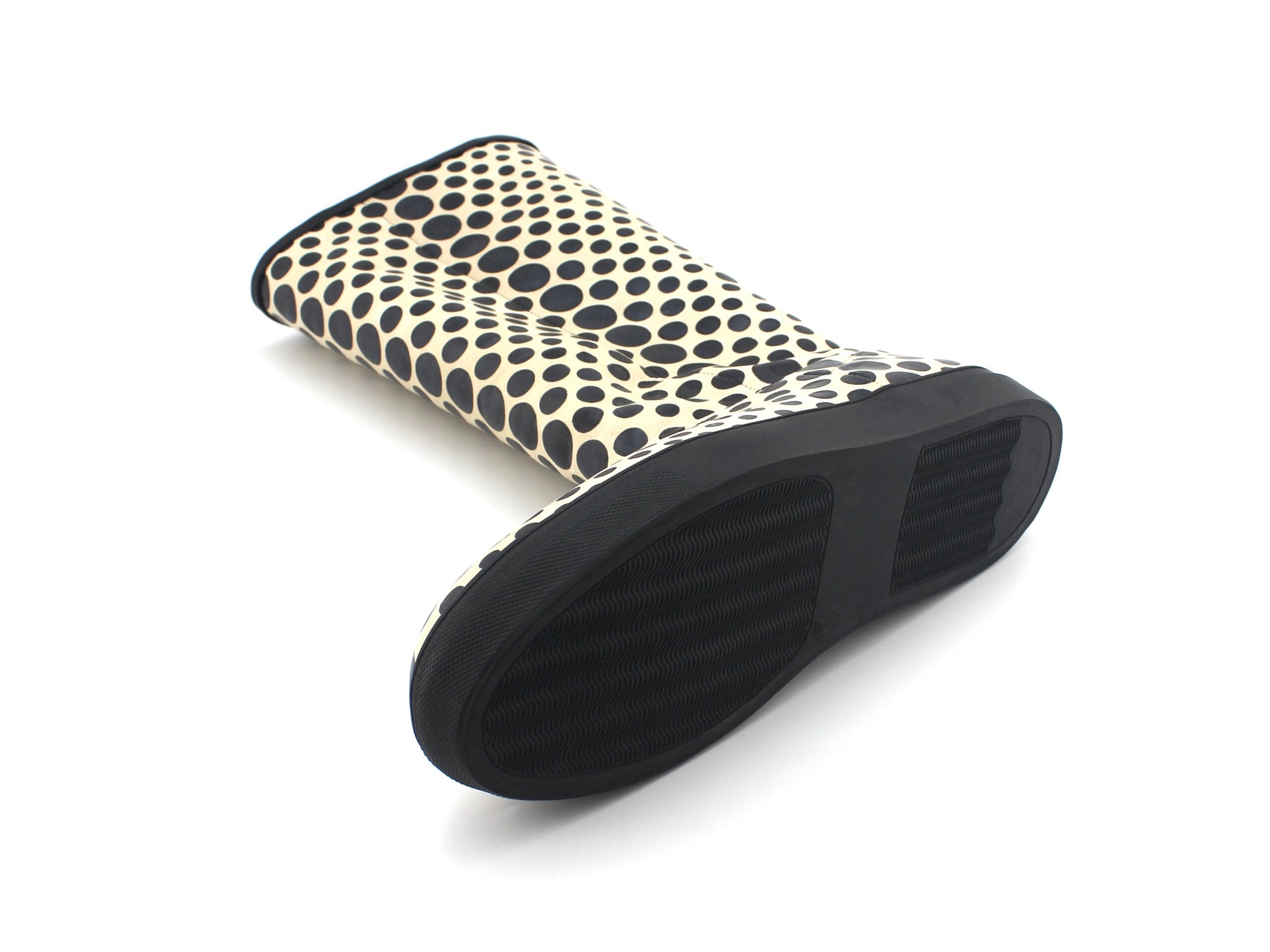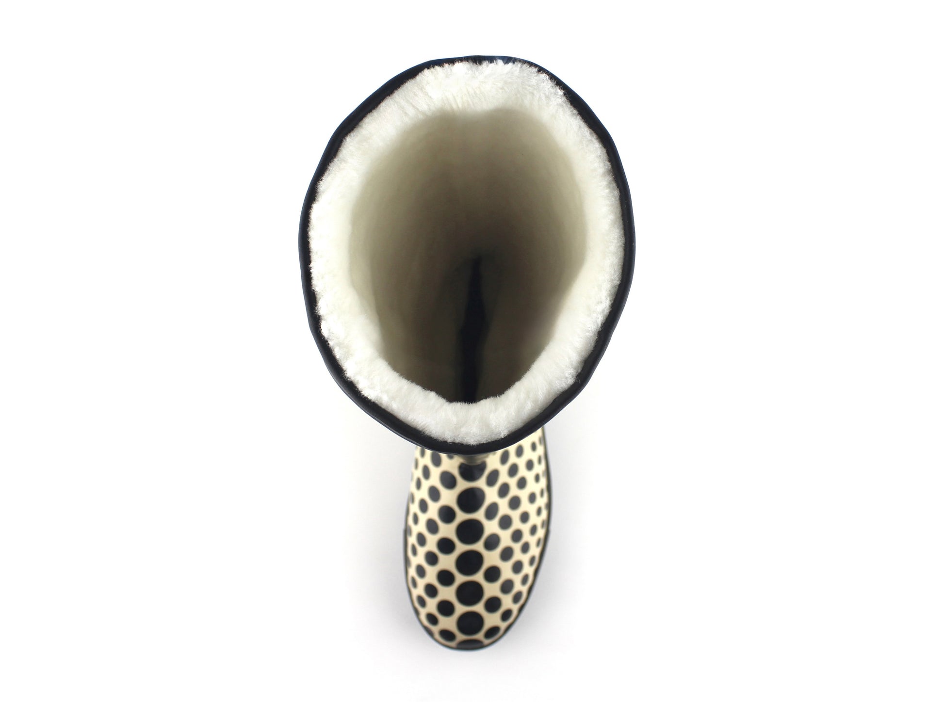 A snuggly 60s Mod-inspired polkadot shearling boot handcrafted in Canada using luxurious materials, such as English Kip leather, plush shearling, and Italian Margom rubber cupsoles. The upper leather is beautifully hand-painted with a deep black leather dye and topped off with a glossy acrylic finish. Over time, the leather will develop a suave patina.
